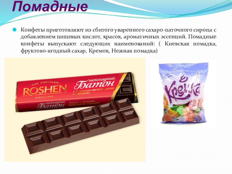 кислот, красок, ароматичных эссенций. Помадные конфеты выпускают следующих наименований: ( Киевская помадка, фруктово-ягодный сахар, Кремок, Нежная помадка)