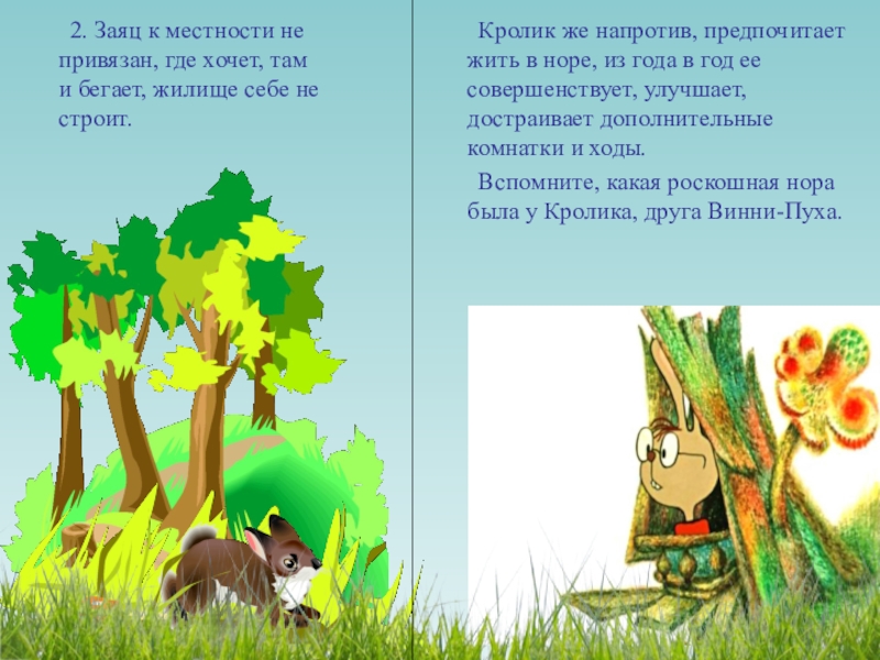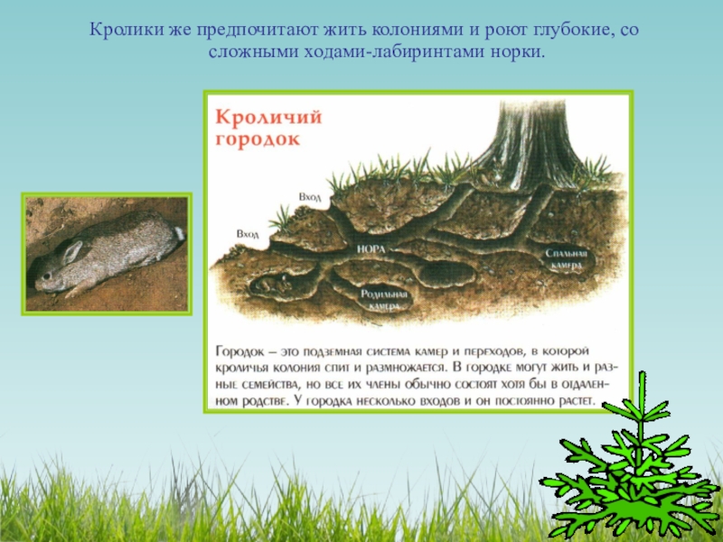 Кролик же напротив, предпочитает жить в норе, из года в год ее совершенствует, улучшает, достраивает дополнительные комнатки и ходы.