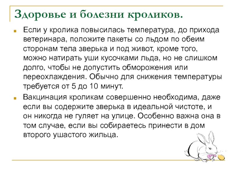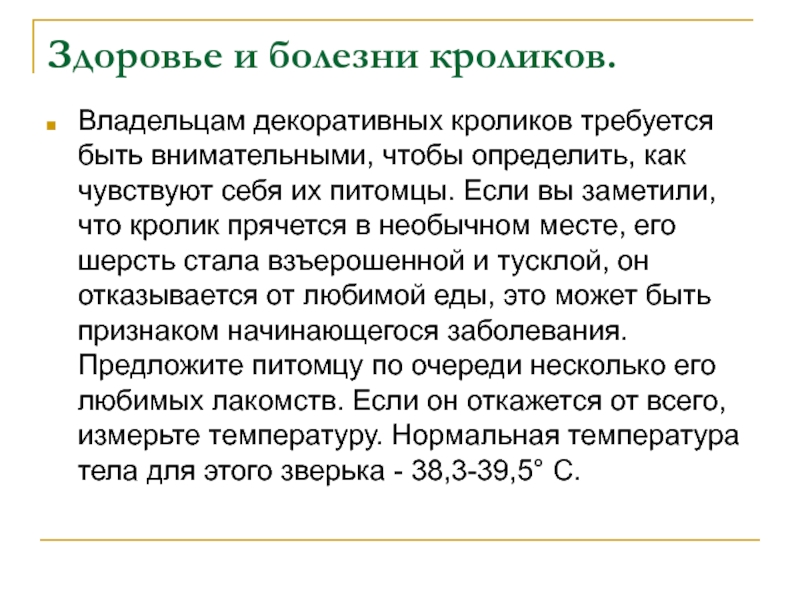как чувствуют себя их питомцы. Если вы заметили, что кролик прячется в необычном месте, его шерсть стала взъерошенной и тусклой, он отказывается от любимой еды, это может быть признаком начинающегося заболевания. Предложите питомцу по очереди несколько его любимых лакомств. Если он откажется от всего, измерьте температуру. Нормальная температура тела для этого зверька - 38,3-39,5° С.