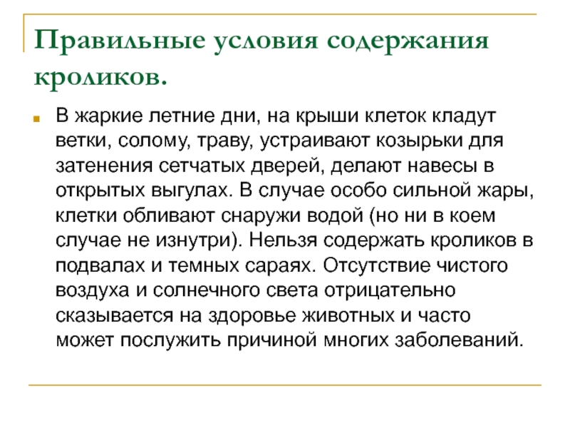 ветки, солому, траву, устраивают козырьки для затенения сетчатых дверей, делают навесы в открытых выгулах. В случае особо сильной жары, клетки обливают снаружи водой (но ни в коем случае не изнутри). Нельзя содержать кроликов в подвалах и темных сараях. Отсутствие чистого воздуха и солнечного света отрицательно сказывается на здоровье животных и часто может послужить причиной многих заболеваний.