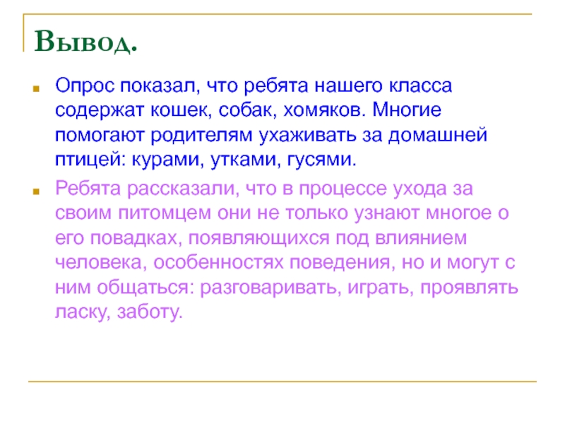 Опрос показал, что ребята нашего класса содержат кошек, собак, хомяков. Многие