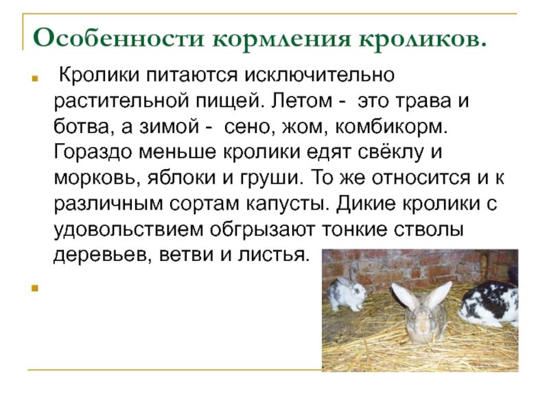 трава и ботва, а зимой - сено, жом, комбикорм. Гораздо меньше кролики едят свёклу и морковь, яблоки и груши. То же относится и к различным сортам капусты. Дикие кролики с удовольствием обгрызают тонкие стволы деревьев, ветви и листья.