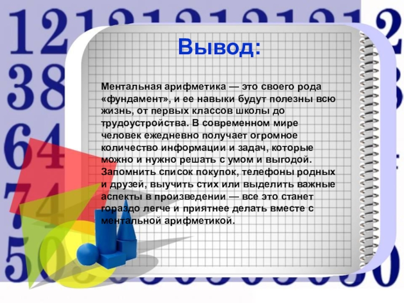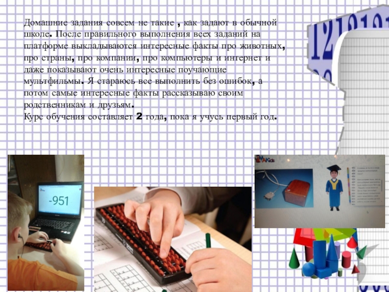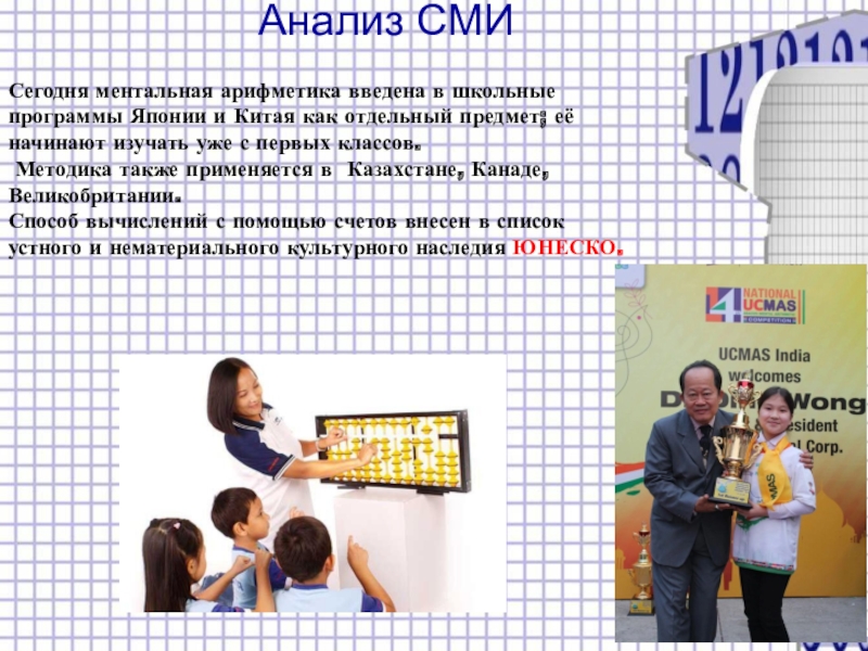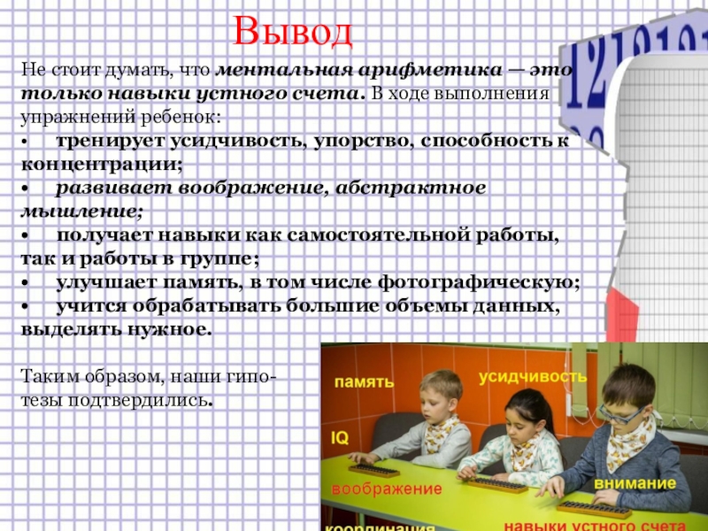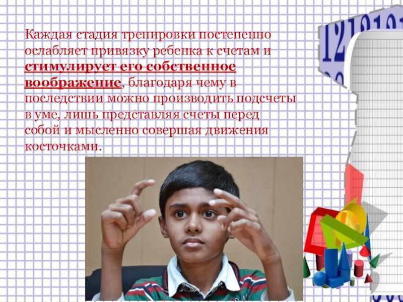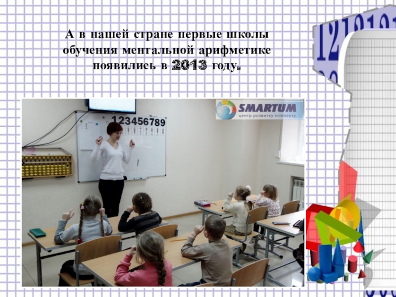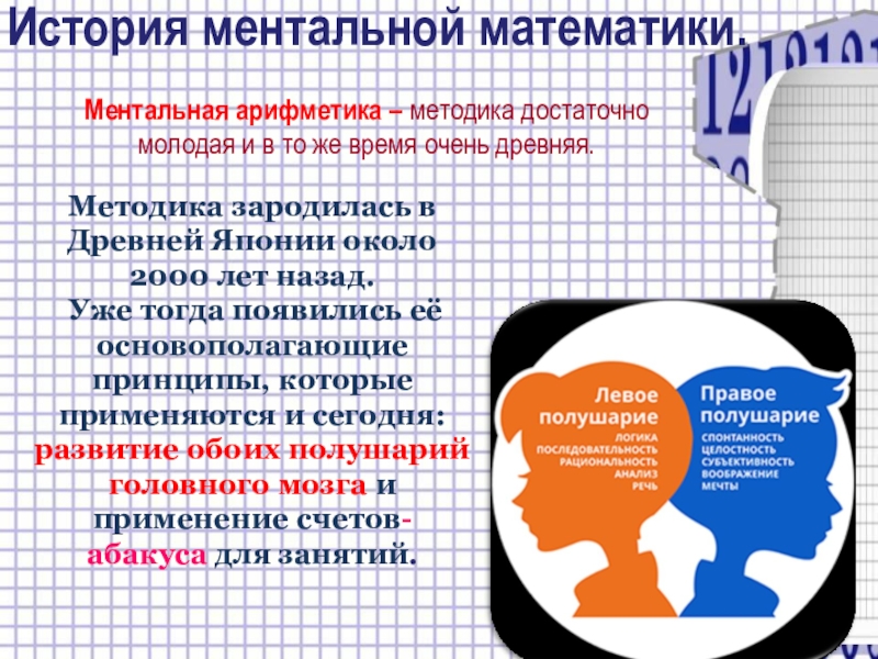 Уже тогда появились её основополагающие принципы, которые применяются и сегодня: развитие обоих полушарий головного мозга и применение счетов-абакуса для занятий.