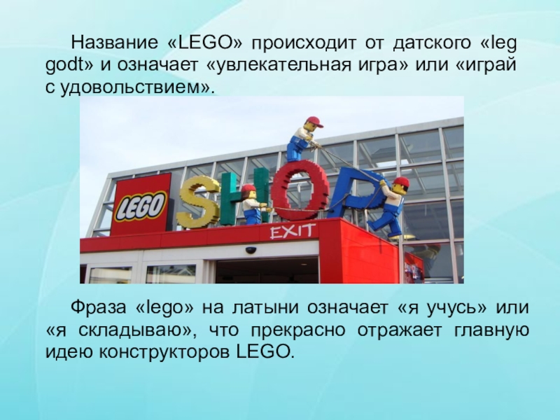 Фраза «lego» на латыни означает «я учусь» или «я складываю», что прекрасно отражает главную идею конструкторов LEGO.