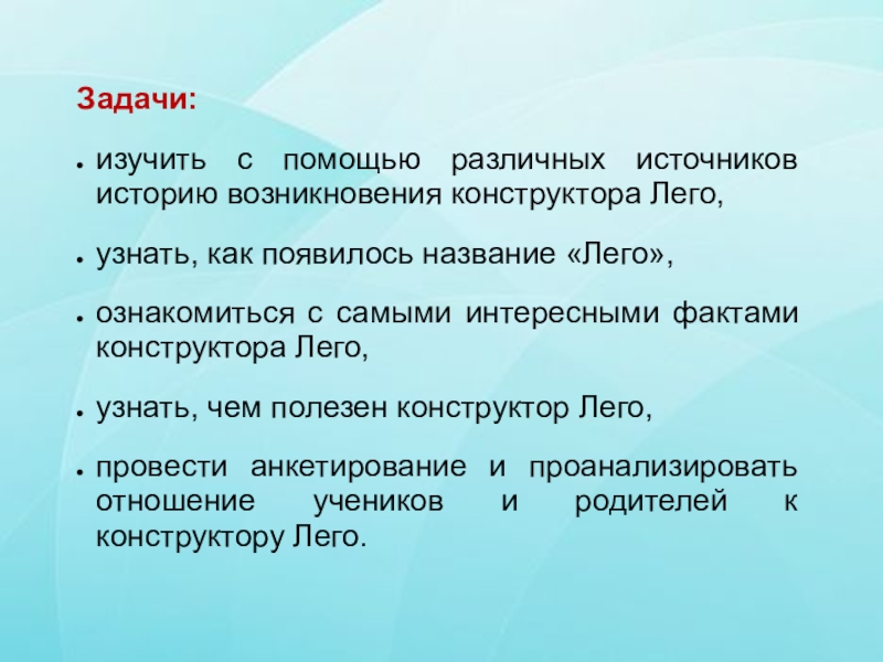 провести анкетирование и проанализировать отношение учеников и родителей к конструктору Лего.