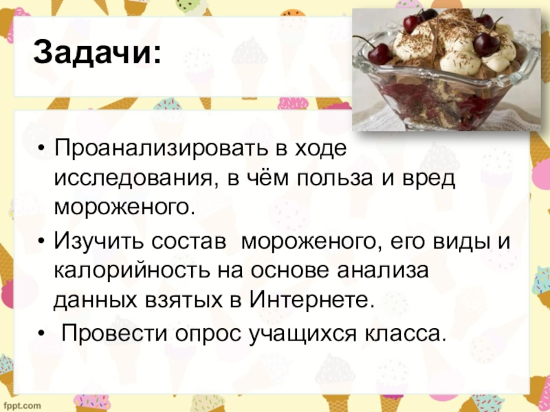 Проанализировать в ходе исследования, в чём польза и вред мороженого.