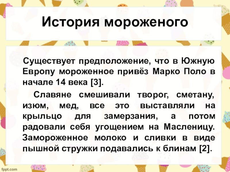 мороженное привёз Марко Поло в начале 14 века [3].