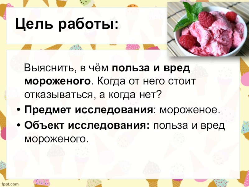 Объект исследования: польза и вред мороженого.