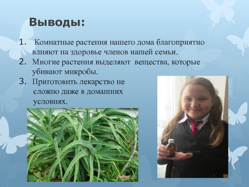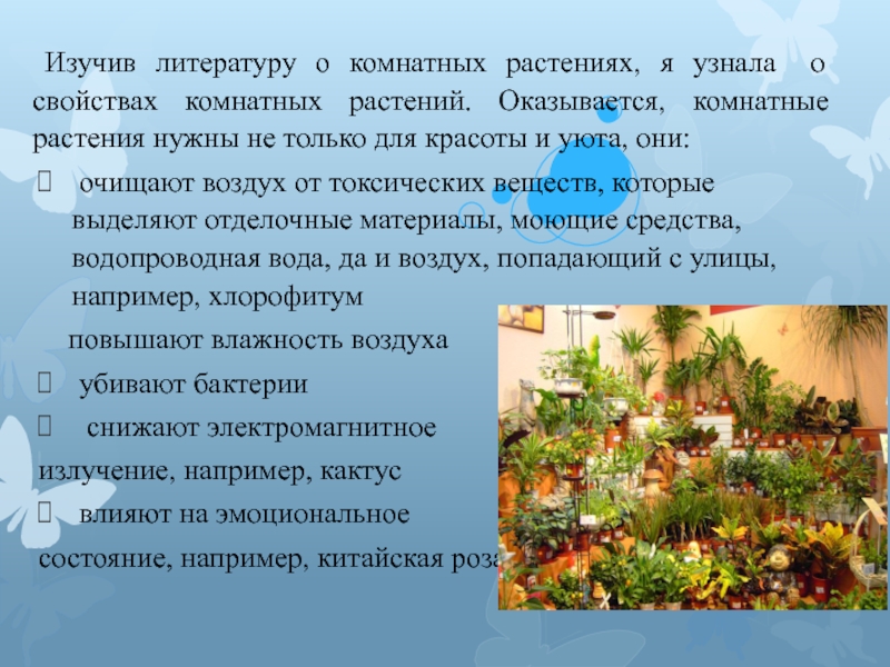 Слайд 13 Изучив литературу о комнатных растениях, я узнала о свойствах комнатных