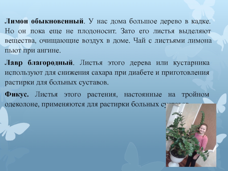 пока еще не плодоносит. Зато его листья выделяют вещества, очищающие воздух в доме. Чай с листьями лимона пьют при ангине.