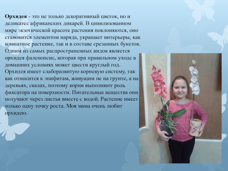 дикарей. В цивилизованном мире экзотической красоте растения поклоняются, оно становится элементом наряда, украшает интерьеры, как комнатное растение, так и в составе срезанных букетов. Одним из самых распространенных видов является орхидея фаленопсис, которая при правильном уходе в домашних условиях может цвести круглый год. Орхидея имеет слаборазвитую корневую систему, так как относится к эпифитам, живущим не на грунте, а на деревьях, скалах, поэтому корни выполняют роль фиксатора на поверхности. Питательные вещества они получают через листья вместе с водой. Растение имеет только одну точку роста. Моя мама очень любит орхидею.