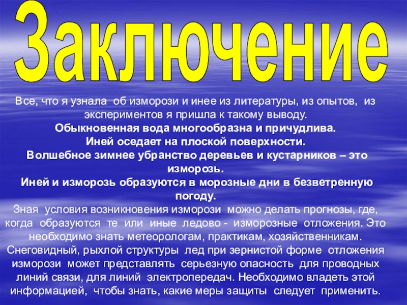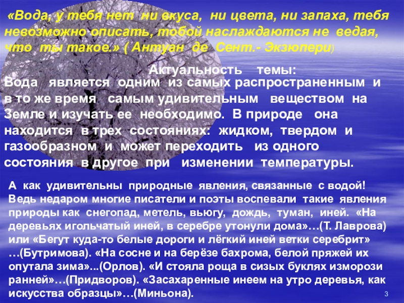 А как удивительны природные явления, связанные с водой! Ведь недаром многие писатели и поэты воспевали такие явления природы как снегопад, метель, вьюгу, дождь, туман, иней. «На деревьях игольчатый иней, в серебре утонули дома»…(Т. Лаврова) или «Бегут куда-то белые дороги и лёгкий иней ветки серебрит»…(Бутримова). «На сосне и на берёзе бахрома, белой пряжей их опутала зима»...(Орлов). «И стояла роща в сизых буклях изморози ранней»…(Придворов). «Засахаренные инеем на утро деревья, как искусства образцы»…(Миньона).