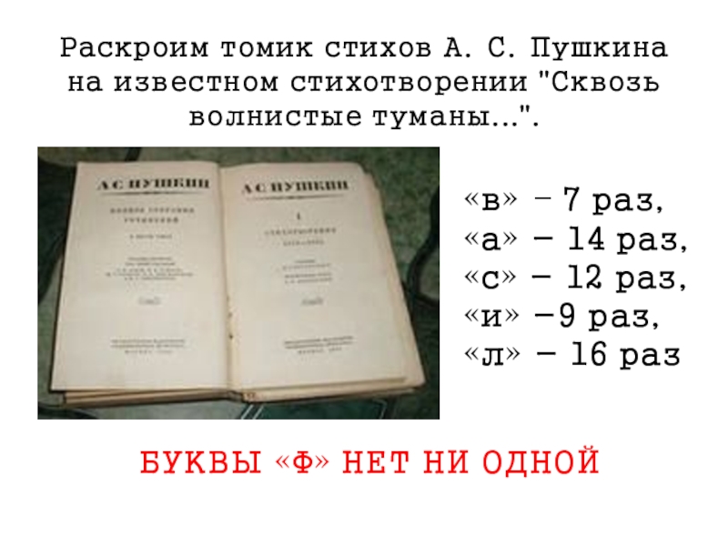 Слайд 18Раскроим томик стихов А. С. Пушкина на известном стихотворении "Сквозь волнистые туманы...".