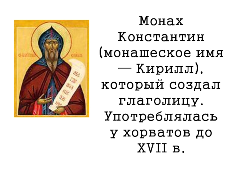 Слайд 9Монах Константин (монашеское имя — Кирилл), который создал глаголицу. Употреблялась у