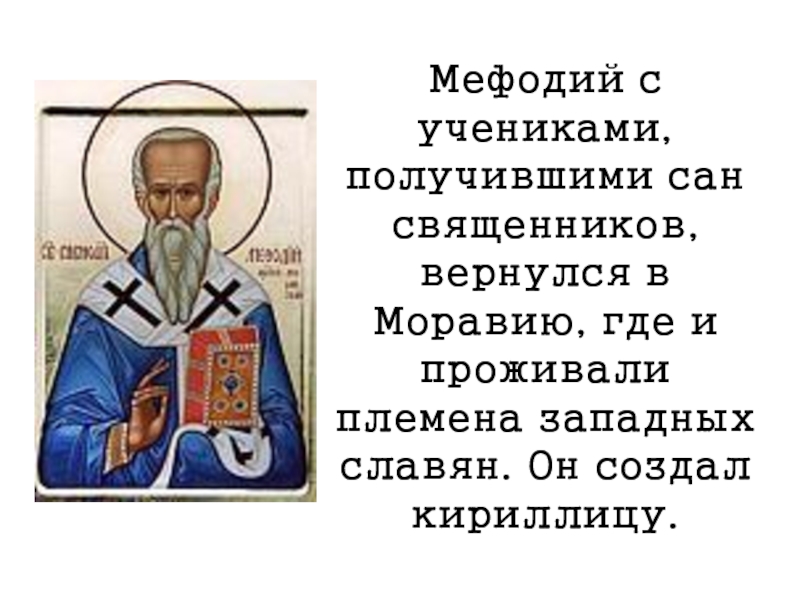 Слайд 10Мефодий с учениками, получившими сан священников, вернулся в Моравию, где и