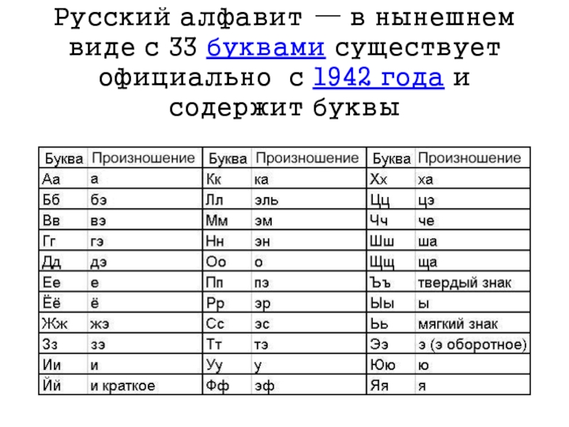 Слайд 14Русский алфавит — в нынешнем виде с 33 буквами существует официально с