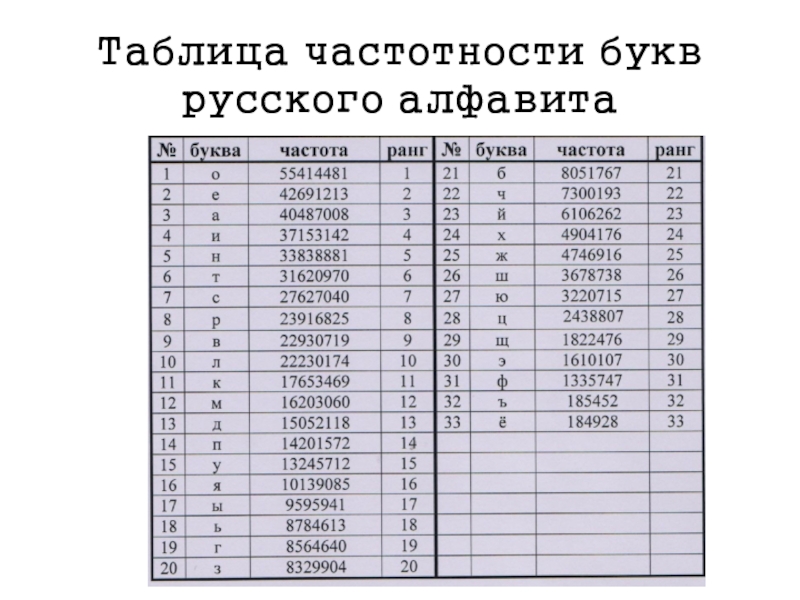 Слайд 22Таблица частотности букв русского алфавита