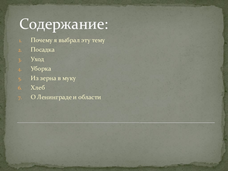 Содержание:Почему я выбрал эту темуПосадкаУходУборкаИз зерна в мукуХлебО Ленинграде и области