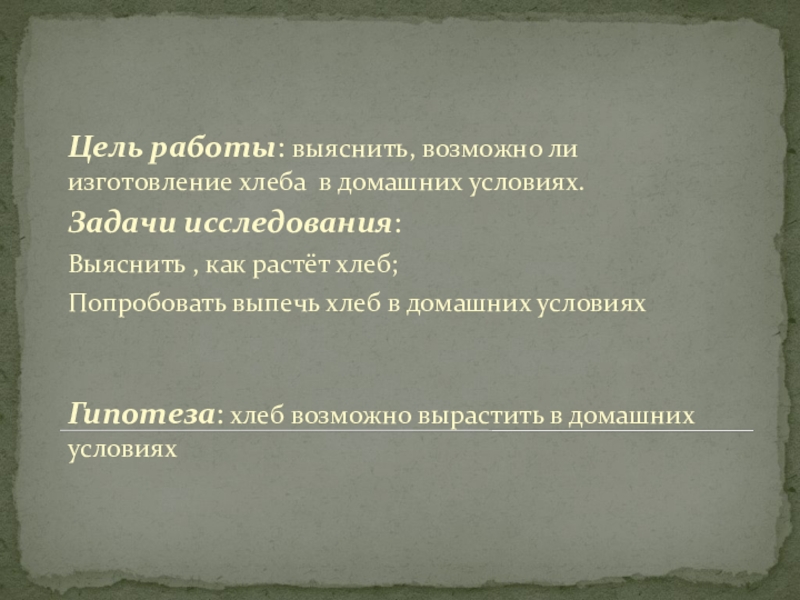 Цель работы: выяснить, возможно ли изготовление хлеба в домашних условиях.Задачи исследования:Выяснить , как растёт хлеб;Попробовать выпечь хлеб
