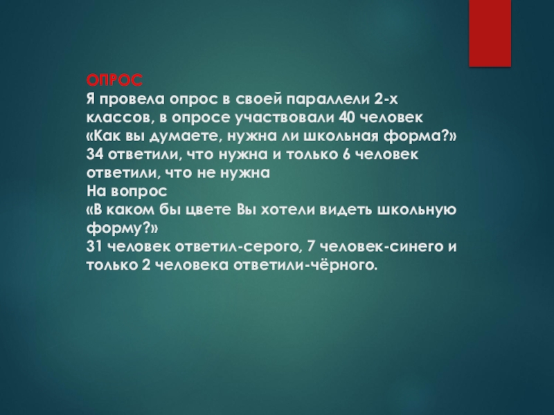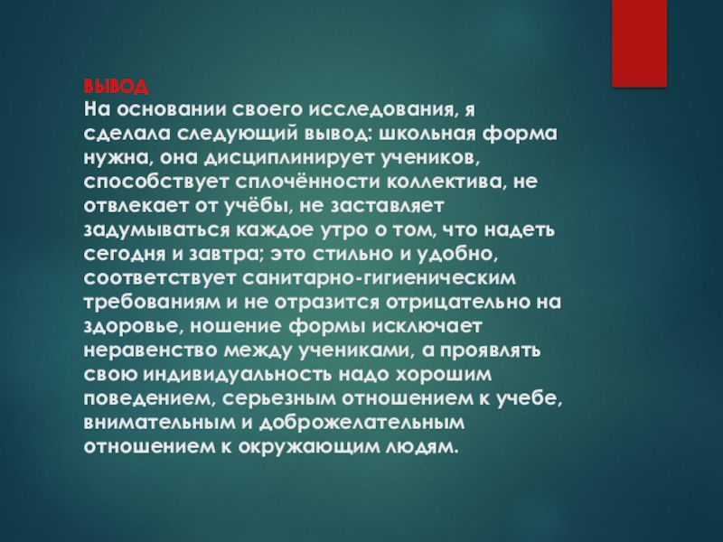 На основании своего исследования, я сделала следующий вывод: школьная форма нужна,