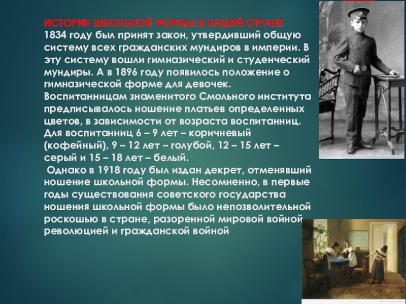 Слайд 3ИСТОРИЯ ШКОЛЬНОЙ ФОРМЫ В НАШЕЙ СТРАНЕ