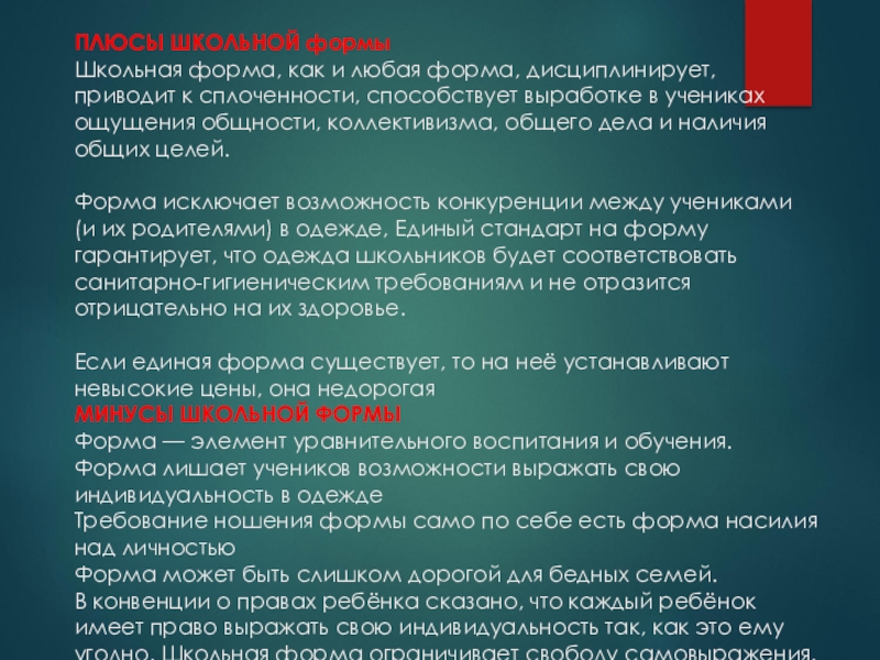 В конвенции о правах ребёнка сказано, что каждый ребёнок имеет право выражать свою индивидуальность так, как это ему угодно. Школьная форма ограничивает свободу самовыражения.