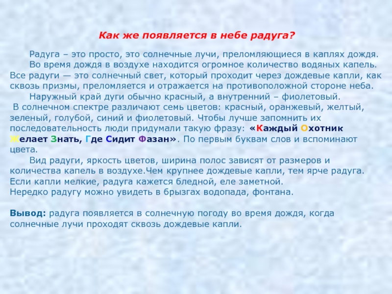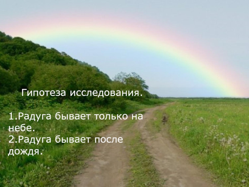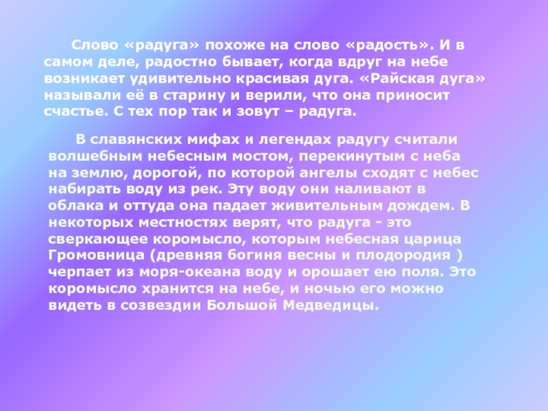 В славянских мифах и легендах радугу считали волшебным небесным мостом, перекинутым с неба на землю, дорогой, по которой ангелы сходят с небес набирать воду из рек. Эту воду они наливают в облака и оттуда она падает живительным дождем. В некоторых местностях верят, что радуга - это сверкающее коромысло, которым небесная царица Громовница (древняя богиня весны и плодородия ) черпает из моря-океана воду и орошает ею поля. Это коромысло хранится на небе, и ночью его можно видеть в созвездии Большой Медведицы.