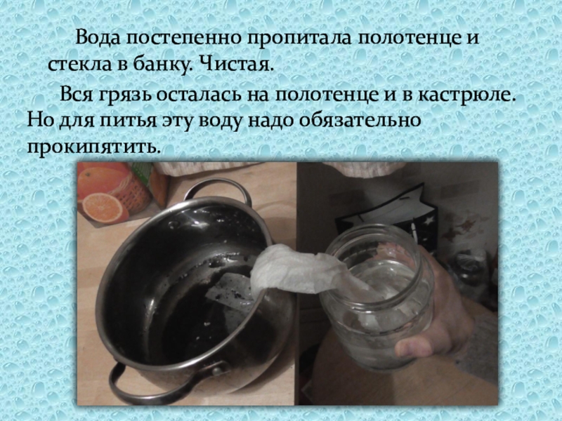 Вся грязь осталась на полотенце и в кастрюле. Но для питья эту воду надо обязательно прокипятить.