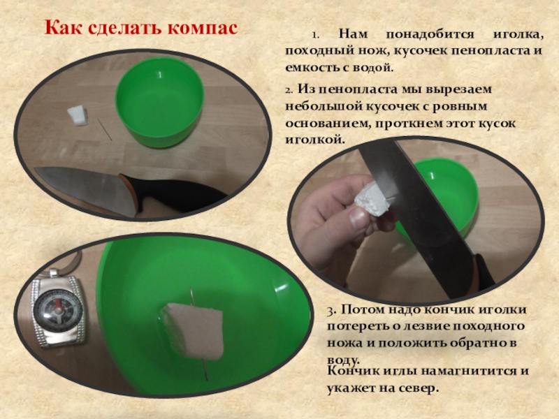 3. Потом надо кончик иголки потереть о лезвие походного ножа и положить обратно в воду.