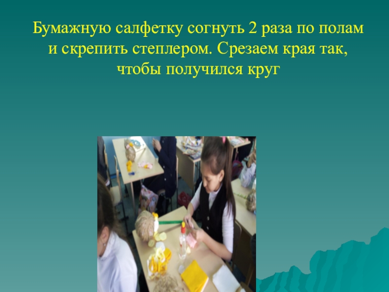 Бумажную салфетку согнуть 2 раза по полам и скрепить степлером. Срезаем