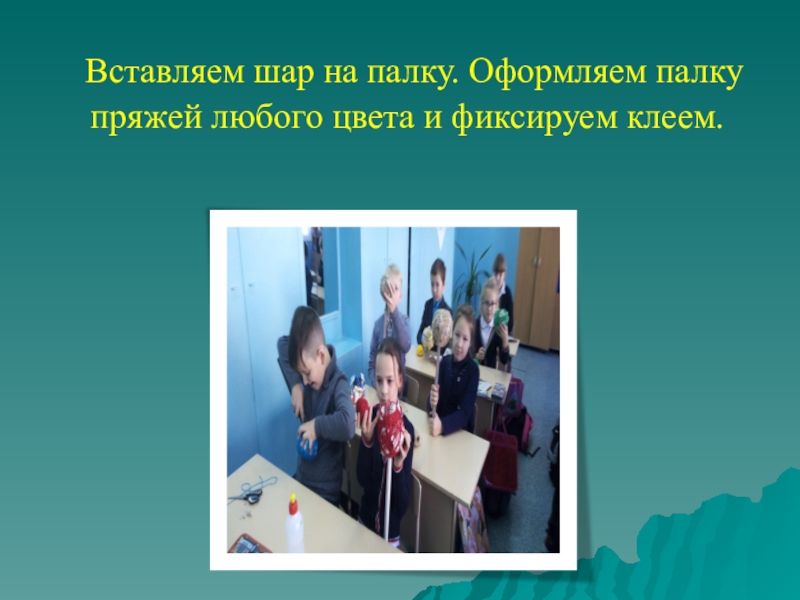 Слайд 14 Вставляем шар на палку. Оформляем палку пряжей любого цвета и