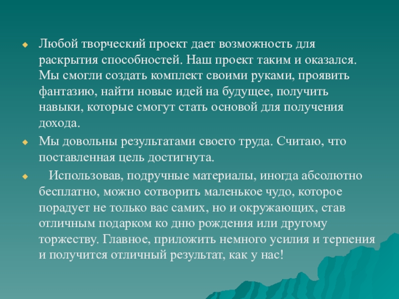 Любой творческий проект дает возможность для раскрытия способностей. Наш проект таким