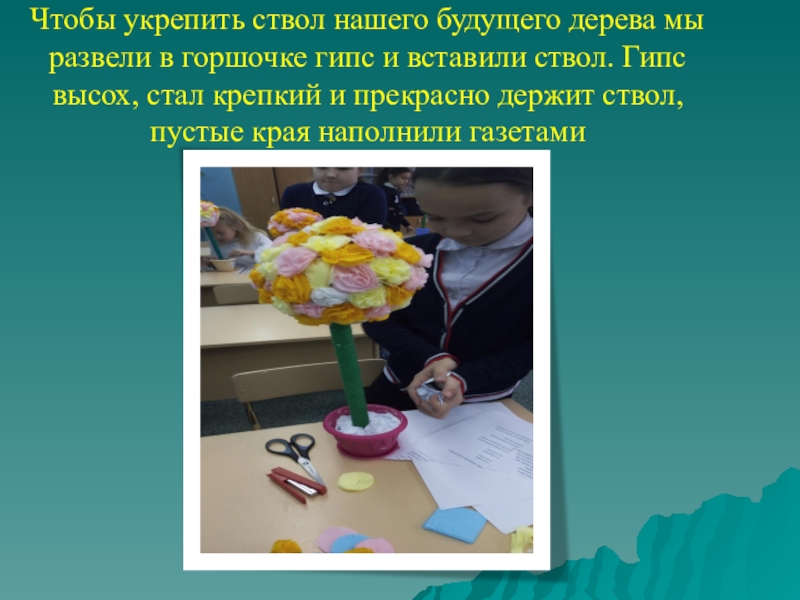 Слайд 17Чтобы укрепить ствол нашего будущего дерева мы развели в горшочке гипс