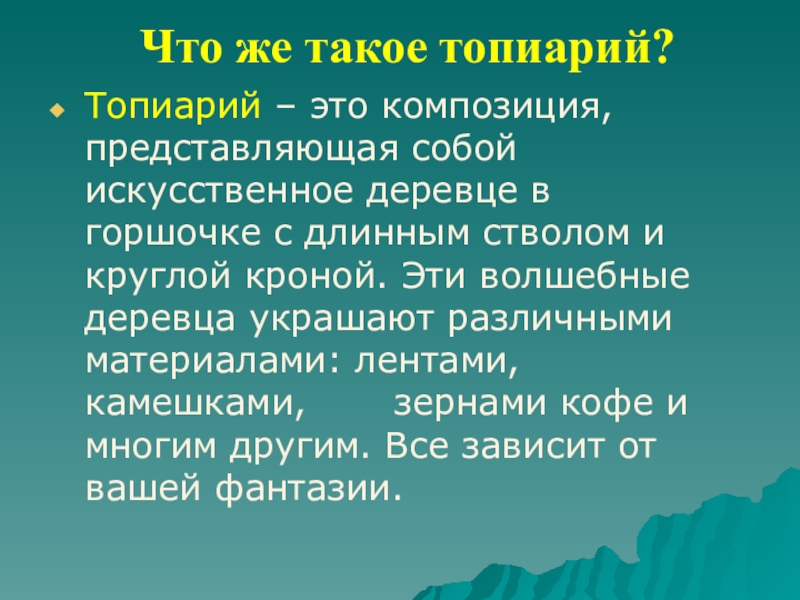 в горшочке с длинным стволом и круглой кроной. Эти волшебные деревца украшают различными материалами: лентами, камешками, зернами кофе и многим другим. Все зависит от вашей фантазии.