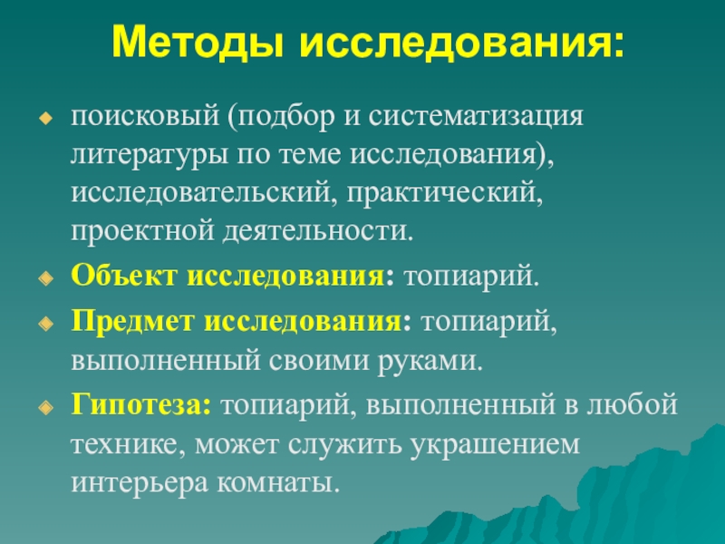 Гипотеза: топиарий, выполненный в любой технике, может служить украшением интерьера комнаты.