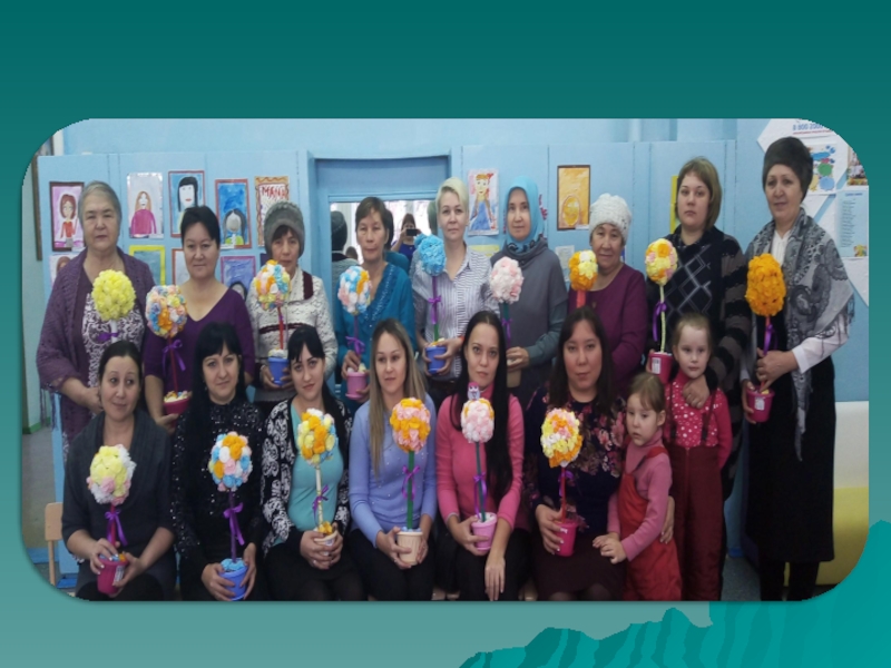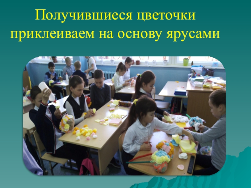 Слайд 16Получившиеся цветочки приклеиваем на основу ярусами
