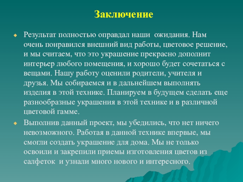 Выполнив данный проект, мы убедились, что нет ничего невозможного. Работая в данной технике впервые, мы смогли создать украшение для дома. Мы не только освоили и закрепили приемы изготовления цветов из салфеток и узнали много нового и интересного.