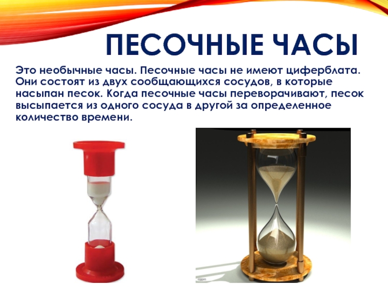 Песочные часыЭто необычные часы. Песочные часы не имеют циферблата. Они состоят из двух сообщающихся сосудов, в которые