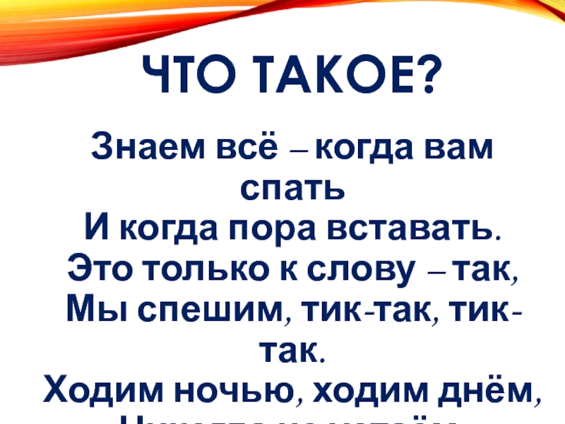 Что такое?Знаем всё – когда вам спать И когда пора вставать. Это только к слову – так, Мы спешим, тик-так, тик-так. Ходим ночью, ходим днём, Никогда не устаём.