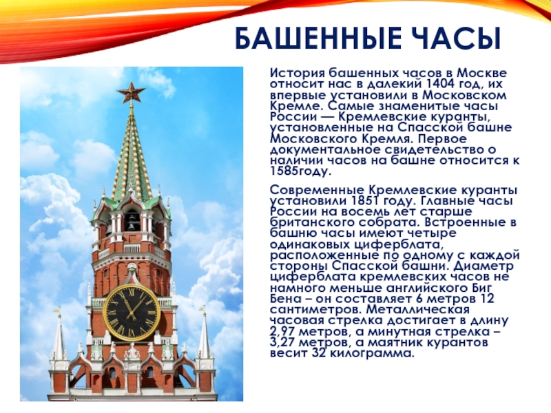 год, их впервые установили в Московском Кремле. Самые знаменитые часы России — Кремлевские куранты, установленные на Спасской башне Московского Кремля. Первое документальное свидетельство о наличии часов на башне относится к 1585году.