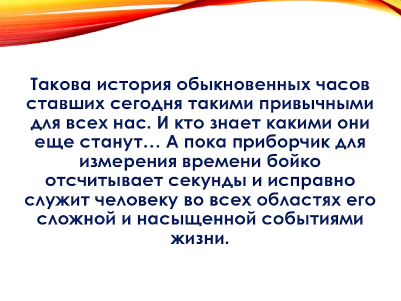 Слайд 12Такова история обыкновенных часов ставших сегодня такими привычными для всех нас.