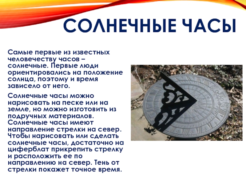 Солнечные часыСамые первые из известных человечеству часов – солнечные. Первые люди ориентировались на положение солнца, поэтому и