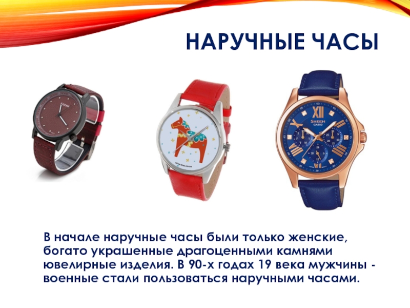 Наручные часыВ начале наручные часы были только женские, богато украшенные драгоценными камнями ювелирные изделия. В 90-х годах