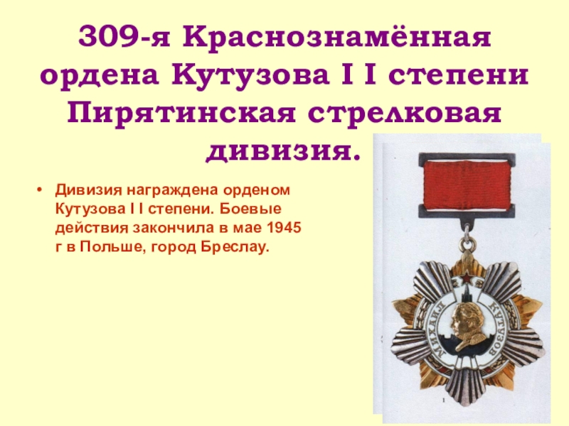 Дивизия награждена орденом Кутузова I I степени. Боевые действия закончила в мае 1945 г в Польше, город Бреслау.