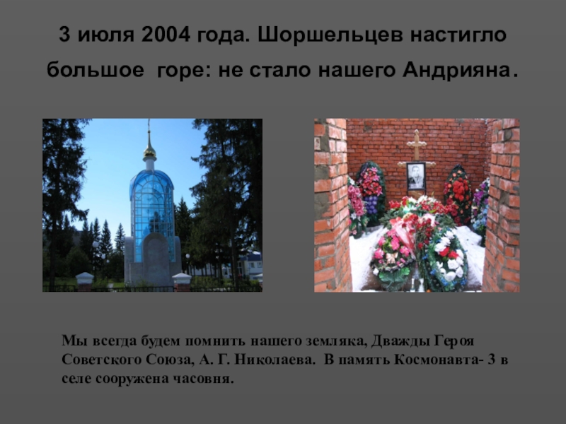 Мы всегда будем помнить нашего земляка, Дважды Героя Советского Союза, А. Г. Николаева. В память Космонавта- 3 в селе сооружена часовня.