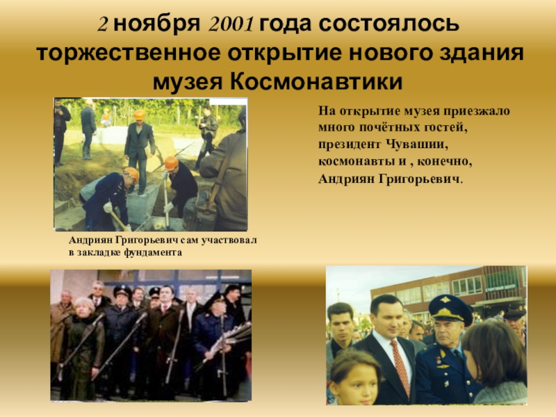На открытие музея приезжало много почётных гостей, президент Чувашии, космонавты и , конечно, Андриян Григорьевич.