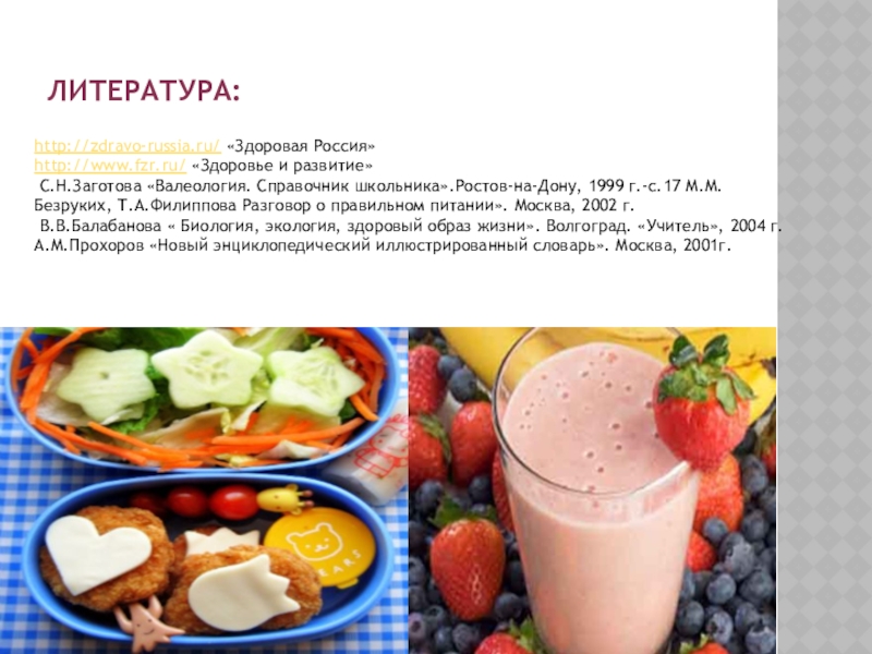 В.В.Балабанова « Биология, экология, здоровый образ жизни». Волгоград. «Учитель», 2004 г. А.М.Прохоров «Новый энциклопедический иллюстрированный словарь». Москва, 2001г.