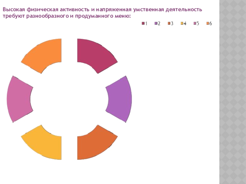 Слайд 4Высокая физическая активность и напряженная умственная деятельность требуют разнообразного и продуманного