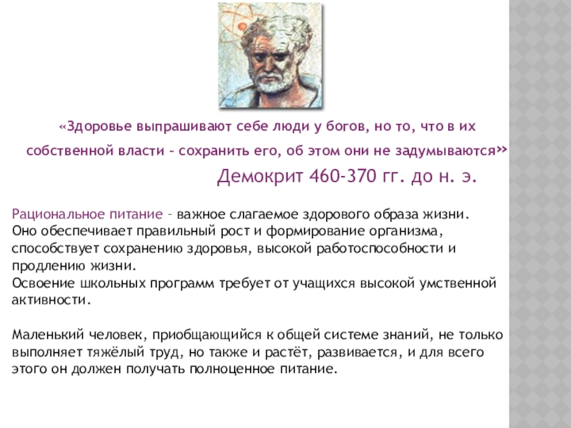 Маленький человек, приобщающийся к общей системе знаний, не только выполняет тяжёлый труд, но также и растёт, развивается, и для всего этого он должен получать полноценное питание.