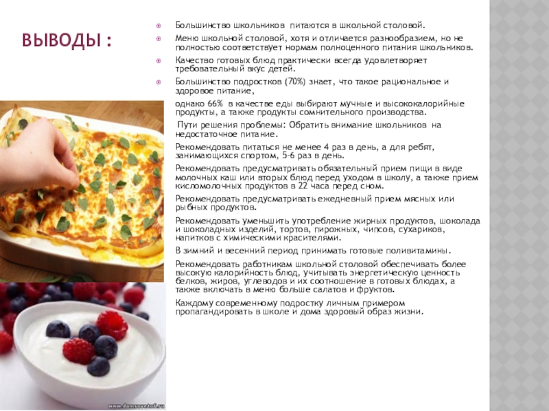 Рекомендовать предусматривать обязательный прием пищи в виде молочных каш или вторых блюд перед уходом в школу, а также прием кисломолочных продуктов в 22 часа перед сном.